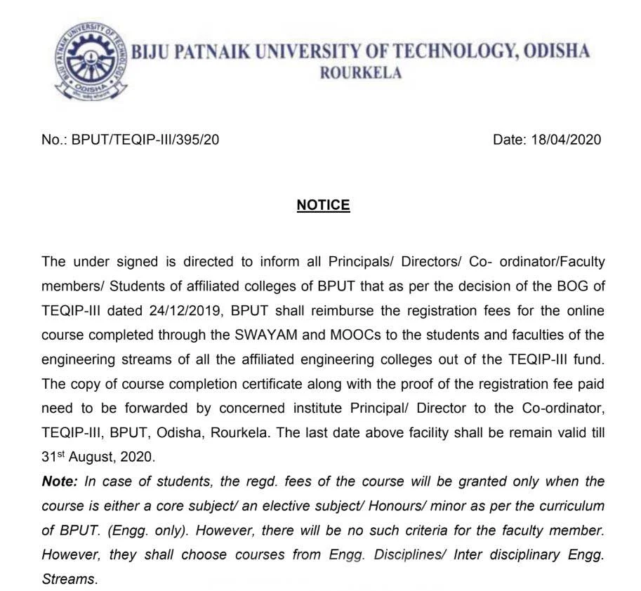 The undersigned is directed to inform all Principals/ Directors/ Coordinator/Faculty members/ Students of affiliated colleges of BPUT that as per the decision of the BOG of TEQIP-III dated 24/12/2019, BPUT shall reimburse the registration fees for the online course completed through the SWAYAM and MOOCs to the students and faculties of the engineering streams of all the affiliated engineering colleges out of the TEQIP-III fund. The copy of the course completion certificate along with the proof of the registration fee paid needs to be forwarded by concerned institute Principal/ Director to the Co-ordinator, TEQIP-III, BPUT, Odisha, Rourkela. The last date above the facility shall remain valid till 31st August 2020.